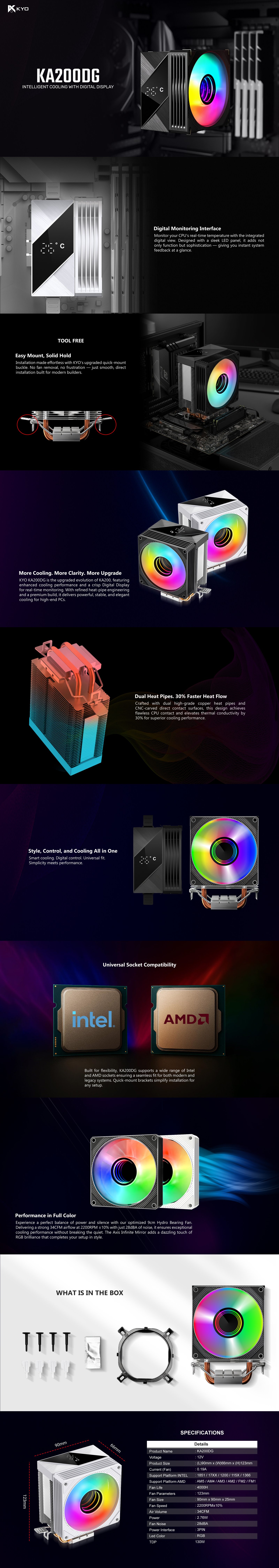 KYO KA200DG Digital CPU Air Cooler BLACK / WHITE Two Heatpipe Single tower With Smart DIGITAL Display
