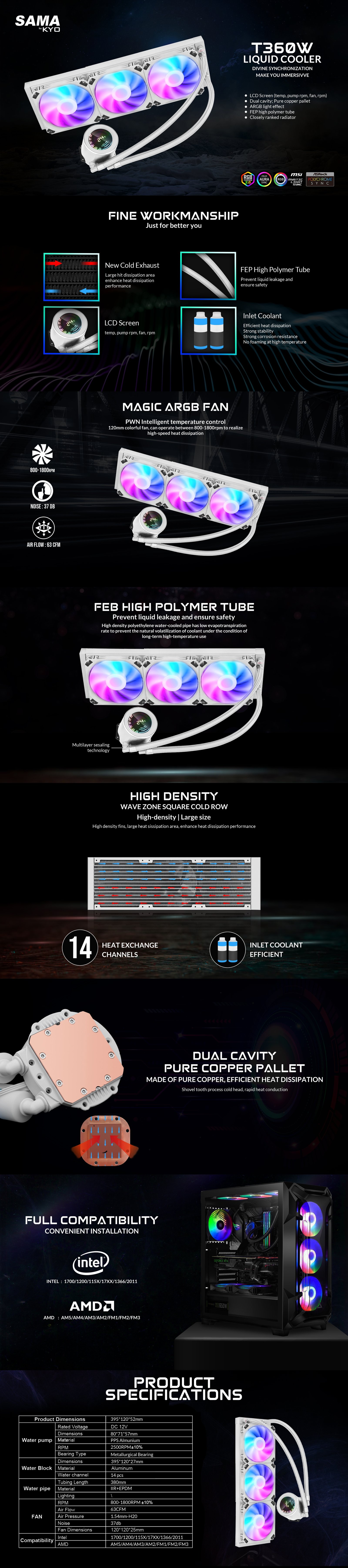 LCD Screen (temp,pumprpm,fan,rpm) Dual cavity; Pure copper pallet ARGB light effect FEP high polymer tube Closely ranked radiator